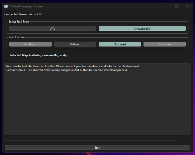 Once you've signed in, you may need to minimize the web browser tab to see the installer. Here you will select the region and map type you'd like to install, then click "Start".