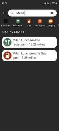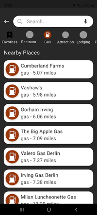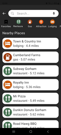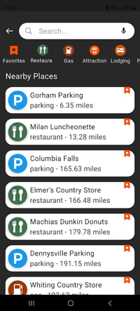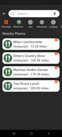 Filtering by category allows you to see all restaurants, fuel stations, etc. on the map, sorted by the nearest distance first.
