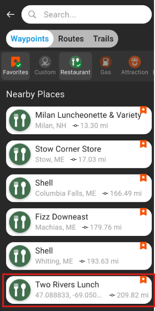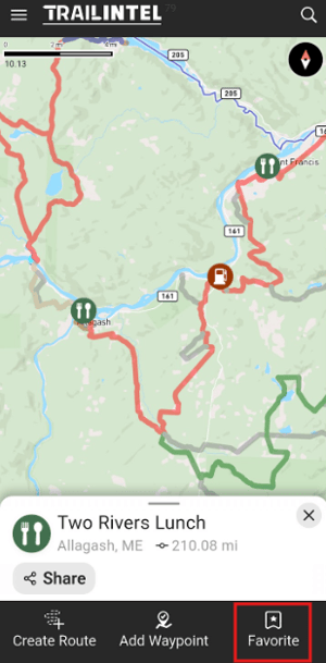 Clicking on the point from this list will bring up the same menu as before, with options to Create Route, Add Waypoint, or Favorite.
